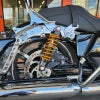 ツーリングモデル用フレームプロテクターとローダウンサスペンションのセット。 重くて走行に不安のあるツーリングモデルを、かなり乗りやすくする2つのパーツのセットです。 【フレームプロテクター】 ●フレームのねじれを抑え、高速走行を安定化させます。 ●ツアラーブレースは左右のアンダーチューブを剛性の高い厚いアルミブロックで固定する事で、走行中に発生するフレームのヨレを大幅に低減します。 【10.8インチサスペンション】 ●プリロード調整、減衰力調整も可能な高品質ローダウンサスペンション。 ●短いながらもストローク量を十分確保しており、非常に快適な乗り心地です。 ●ローダウンサスペンションで減衰力調整も可能な物はこの商品だけです。 ●SOULサスペンションの最大のメリットは、走行性能と乗り心地を犠牲にせずに、ローダウン、減衰力調整が可能になるという点です。 ●通常ローダウンサスペンションは、どうしても乗り心地が犠牲になってしまいますが、SOULサスペンションはストローク量を確保しながら車高を10.8インチまで下げる事が可能です。 ●減衰力調整は、12(ソフト)~1(ハード)まで12クリックの範囲で調整可能です。 ●減衰力調整ダイヤルは上部に付いているのでサドルバッグを外す事なく、気軽に調整可能です。 ※減衰力調整は一番ソフト(12)から試し、好みのセッティングにしてください。 ※プリロード調整レンチは付属しません。