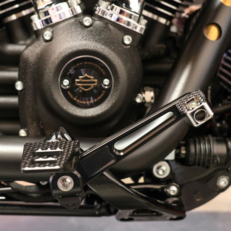 M8ソフテイル ローライダー/S/ST、ストリートボブ、スタンダード用 ブレーキアームです。 よりスポーティーなライディング用に新設計しています。 ピボット下部分の形状が斜めにアングル付けされており、通常のブレーキアームよりもリーンさせた際のバンク角を増しています。 路面と接する部分には摩擦に強いデルロン製プレート付きです。 素材は6061ビレットアルミニウム製。 ブラックカラーのハードアルマイト処理済みです。 ピボット部にはブロンズ製のセルフ給油タイプオイルレスブッシュを使用しており、ノーマルのプラスチックブッシュよりも圧倒的にスムースに作動します。 ミッドコントロール車用 ※ブレーキペグ、フットペグは付属しません。