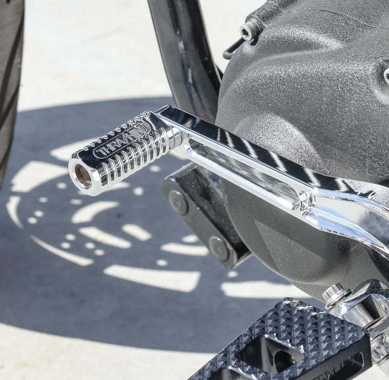 Thrashin Supplyの航空機グレードアルミ・ビレット製のシフターペグ。 トリプルニッケルメッキクローム仕上げとなっていて、車体から比べると小さいパーツにはなりますが、取り付けると光沢感と煌びやかさで存在感あるシフターペグとなっています。 シフターペグには、ブランドロゴが刻印されています。 取付けに必要なハードウェアが付属します。