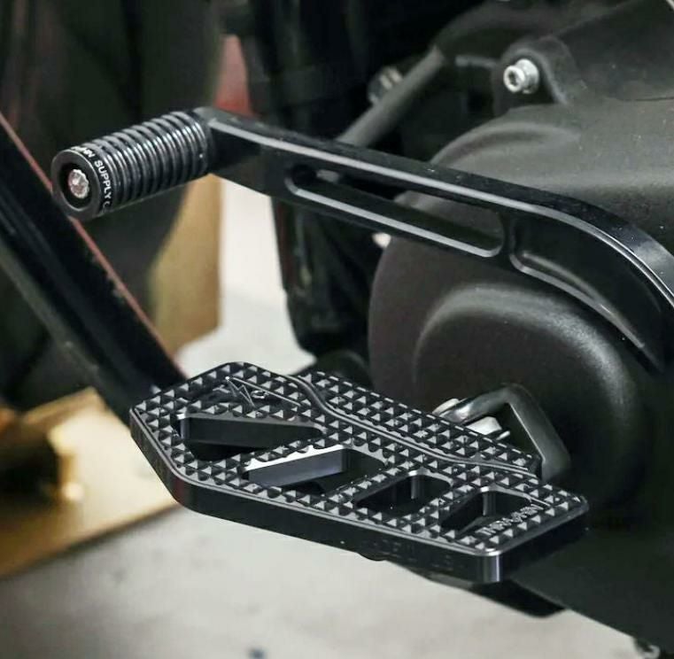 M8ソフテイル用 ミニフロアボードです。 足をしっかりと踏ん張ることが出来、長距離のライディングでも自由度が高く快適なミニフロアボード。 サイドが山型に張り出すシェイプで、スポーティーなルックスかつ、足先を乗せる部分が安定します。 表面は滑り止め模様入りです。 本体は航空機部品グレードの6061ビレットアルミニウム製。 ブラックカラーのハードアルマイト仕上げ。 クレビス部分もアルミニウム製です。 ※ライダー用 左右セット