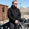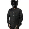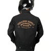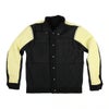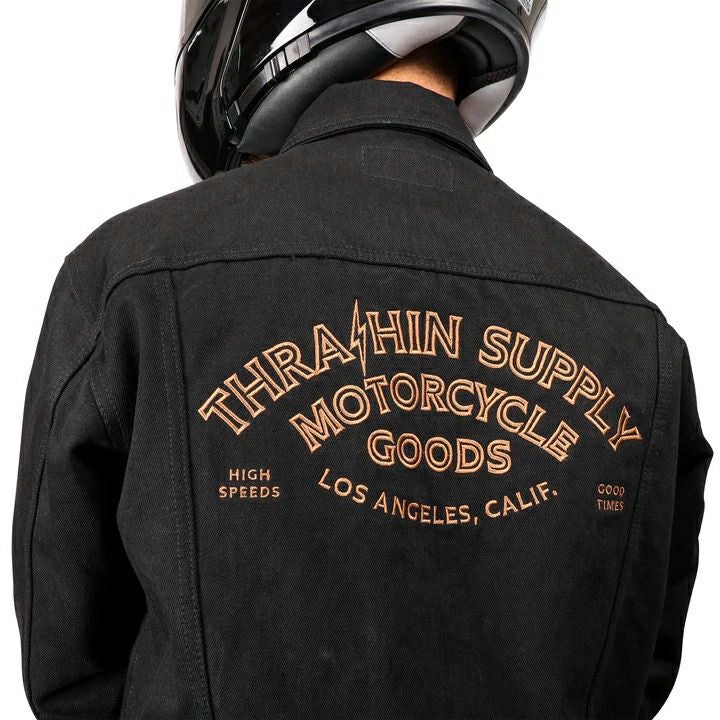 春から秋にかけて手軽に羽織れる、デニムジャケットです。 12オンス・ブラックデニムの背中にはゴールドのThrashin Supply(スラッシンサプライ)刺繍ロゴ入り。 格好の良いスタイルです。 見た目はトラディショナルなデニムジャケットですが、バタつき防止用のエりスナップボタンや、ハンドルに手を伸ばした際に自然な腕のカーブ並びに、腰と袖口の調整ボタンはライダーのための仕様です。 更に背中と肩から肘にかけて、裏面に丈夫なケプラーの裏地付ですので、いざという時に身体を守ってくれます。 ※米国サイズのため、日本サイズよりワンサイズ程度大きめです。