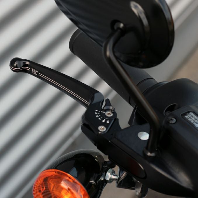 ハーレー用アジャスタブルクラッチレバーです。 ※FLSS,FLSTFBSには2種類のクラッチレバーが存在します。必ず事前に実車と商品画像でご確認下さい。 レバーの遠さを6段階に調整可能です。 ビレットアルミニウム製。CNCマシンによる削り出し加工品です。 レバー本体はブラックアノダイズフィニッシュ。 レバー前面に2本ストライプとWUNDERKIND(ワンダーカインド)のロゴマークがエッチングされています。 ※写真はブレーキレバーです。(デザインイメージ写真) クラッチ用 単品販売