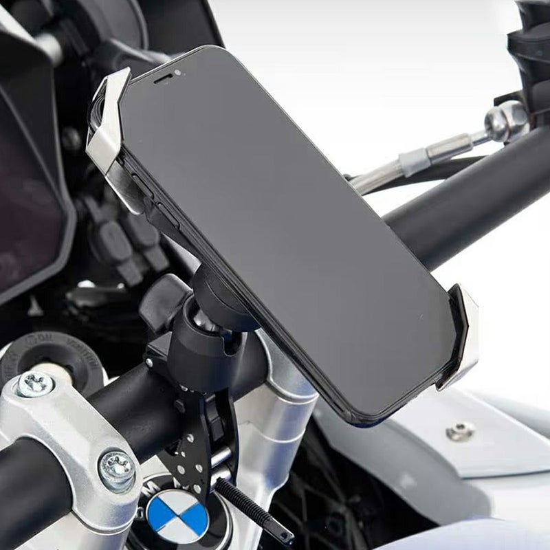 スマートホンを固定できるホルダーです。 バネで伸縮する2個のアームで対角線上の角をホールドする仕組みの、汎用性の高いホルダーです。 長さ135mm~180mm、厚さ11mmまでのスマートホンを装着出来ます。 ロック機構付きで、振動などによる不意な脱落を防止します。 スマートホンとの接触部分は絶縁性の振動吸収スポンジが付いています。 Wunderlich(ワンダーリッヒ)の別売マルチクランプ(W45155-002、W45155-302)に装着します。 取付け角度と縦・横置き調整可能。