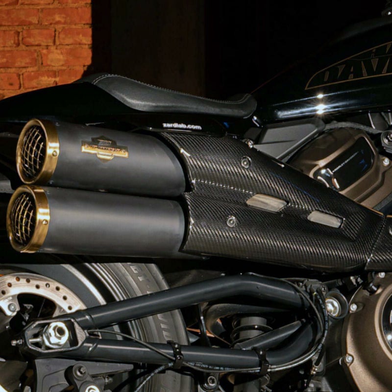 スポーツスターS用 スリップオンマフラーです。 ステンレススチール製。 マフラー本体はブラックの耐熱塗装。 金網スタイルのマフラーエンドとZARD(ザード)のプレートはブロンズの、ハーレー120周年アニバーサリーカラーです。 カーボンファイバー製のヒートシールドにはゴールドの縁取りが入り、マフラーのカラーとマッチします。 キャタライザー内蔵。 EURO5適合品です。