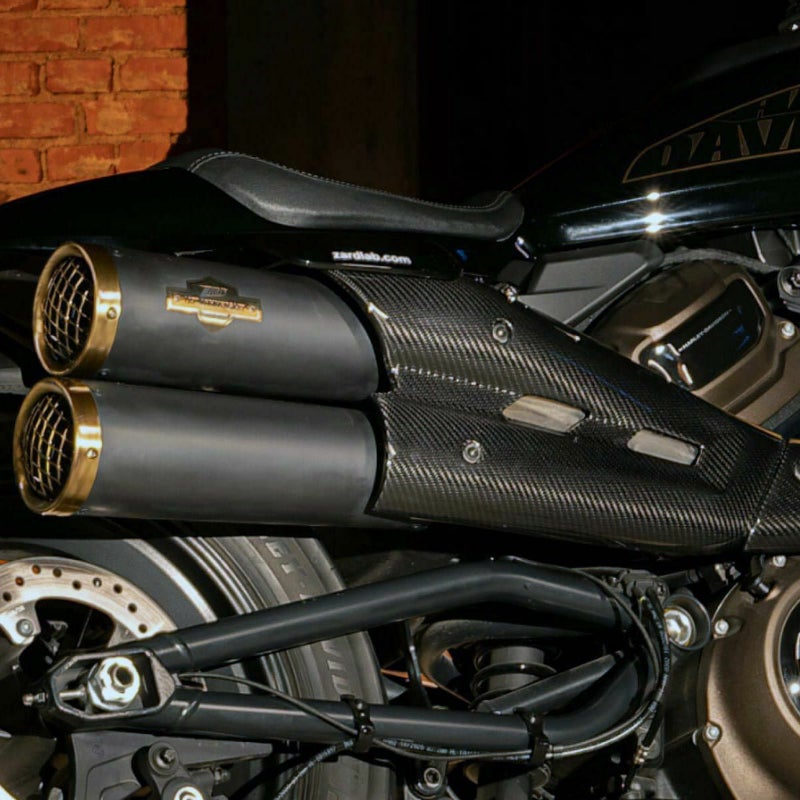 スポーツスターS用 スリップオンマフラーです。 ステンレススチール製。 マフラー本体はブラックの耐熱塗装。 金網スタイルのマフラーエンドとZARD(ザード)のプレートはブロンズの、ハーレー120周年アニバーサリーカラーです。 カーボンファイバー製のヒートシールドにはゴールドの縁取りが入り、マフラーのカラーとマッチします。 キャタライザーの無い、レース仕様。 迫力ある排気音になります。