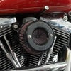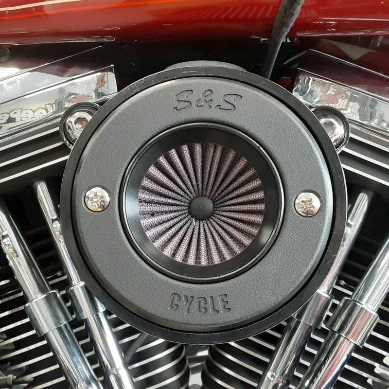 スポーツスター用のハイフロー・エアクリーナー エアの取り込みを、これまでの側面に加え、前面からも吸気することで、更に大量の空気を取り込めるエアクリーナーです。 ステルス用エアフィルターに加え、前面のフィルタープレートが加わり、ノーマル比55パーセントアップのエアを取り込めます。 前面のフィルターもステルスエアフィルターと同様に繰り返し洗浄して使用できます。 S&Sのロゴ入りリングプレート付です。 ※装着写真は他車両になります。