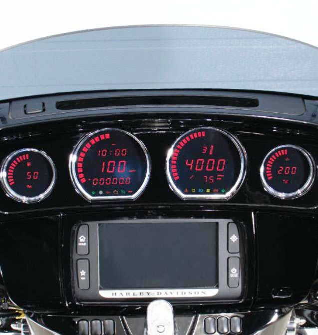 ハーレーのノーマルメーターと交換するだけのデジタルメーター4個キットです。 スピード、タコ、燃料計、油温計 表示色はレッドです。 ※表示色の切り替え機能はありません。 装着にはドリル加工等の加工は不要です。 配線もプラグアンドプレイで簡単です。 主な表示機能: 1.スピードメーター: ・0~299km (0-199MPH) ・時計 ・オドメーター ・メンテナンスアラート ・残燃料走行可能距離 ・平均燃費 ・ターンシグナル ・オイル警告灯 ・エンジンチェックランプ ・セキュリティ警告灯 2.タコメーター: ・0~9,990RPM ・ギア表示 ・エンジン温度 摂氏-40~300度(華氏-40~572度) ・電圧計 8~18V ・タイヤ空気圧(センサー装着車) ・水温灯 ・警告灯 ・ハイビーム ・フォグライト ・ABS警告灯 ・ターンシグナル 3.燃料計: ・0~100% 4.油温計: ・華氏0~400度(摂氏32~248度) ・油温警告灯 華氏140~400度(摂氏60~248度)で設定
