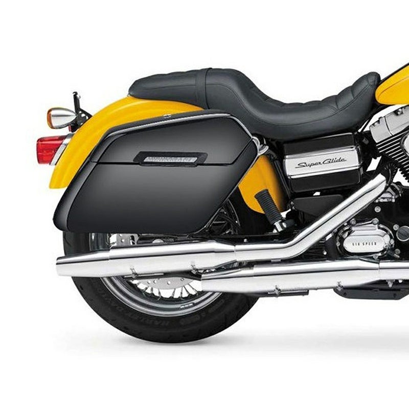 ハーレー・ダイナスーパーグライド用のハードサドルバッグです。 グラスファイバー製。 グロスブラックに塗装済み。 雨が降っても中のものが濡れず、安心して使えます。 リッドは内側から外に向かって開くので、バイクにまたがったままでも荷物の出し入れがし易く、便利です。 リッドはレバーでロックできます。 更にリッドにはキーロック付きですので、バイクを離れる際も安心です。 取付けは専用ブラケットを車体にボルトオンし、バッグをボルト止めします。 ※バッグ裏面にボルト用穴開け加工が必要です。 ターンシグナルは移設が必要です。 ※ターンシグナル移設キット付属。 ブラケットおよび取り付けに必要なハードウェアが付属します。 左右ペア