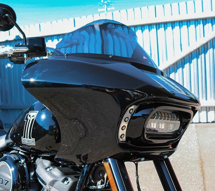 スポーツグライド用のミニシャークノーズタイプフェアリングです。 ノーマルのフェアリングよりも横の張り出しが大きく、角型のヘッドライトと相まってアグレッシブなルックスになります。 Paul Yaffeの特許取得 インテグラルEZマウントシステムで、ボルトオンで装着出来ます。 ウィンドシールド(SF9等)は別売です。 ※ヘッドライトは付属しません。 M8ソフテイル・ファットボブ用ヘッドライト(67700288 A/B, WMW-L100など)および、ヘッドライトハーネス(69201774)が別途必要です。 ※写真のミニLEDライトは付属しません。 旧型番:SFK