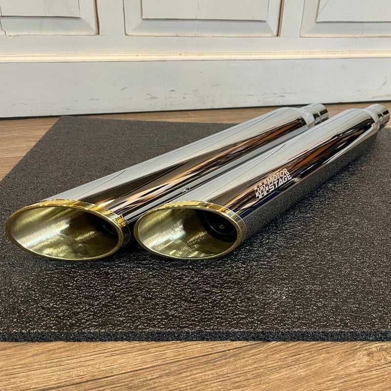 【アウトレット】BABY90SL-CG-M8 M8ソフテイル スリップオンマフラー 90スラッシュ クローム/金エンド モーターステージ