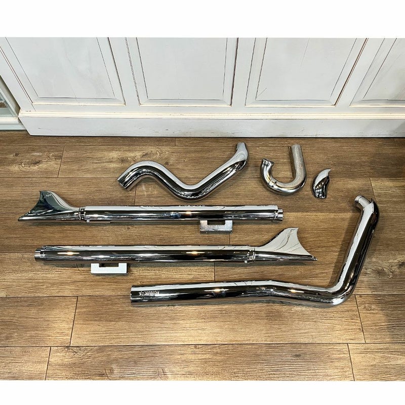 ソフテイルをレトロなデザインにしてハーレーの音に変えるフィッシュテイルの両出しマフラー。 長さは36インチ(約91cm)。エキパイの太さは2.5インチ。 ハードサドルバッグを装備した場合、マフラーのエンドが丁度サドルバッグと干渉しない位置になります。 低音が響き、パワーもアップします。 低速トルクを犠牲にせずパワーを出す為に、エキパイ部分は1.75インチ ->1.87インチ ->2インチと内径が徐々に変化する構造になっています。 アフターが出にくい、パワーとトルクが出る、そして低音がそのまま出る構造になっています。 エンド部に傷があります。