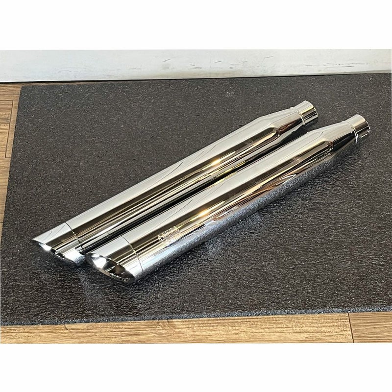 3インチスリップオン・マフラー。 ハーレーらしい低音が出ます。 音量は大きめです。 エンド部分は回転して3か所の向きにセットできます。 (スラッシュダウン又はスラッシュアウトに変更可能) ※2017のダイナはスリップオンマフラーの交換時に別途ガスケット(品番:65900017A、68-10199、568428)が必要です。(※FXDF、FXDWG、FXDLSは除く) エンドキャップ取付部(境目)に写真に写らないような線状のメッキ剥がれがあります。