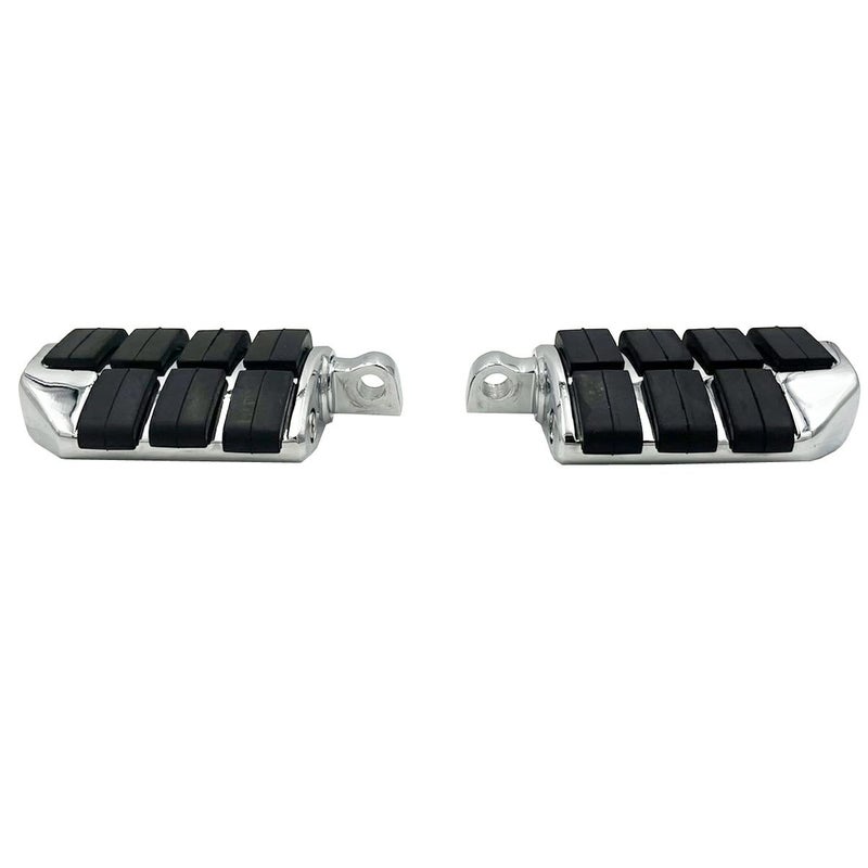 色々な体格のライダー用に調整できるハイウェイペグです。 アジャスタブルハイウェイペグにはショート・タイプとロング・タイプがあり、アームの長さが異なります。 ロングタイプはアームが長いので後にセットすればかなり手前(フットボードの横近く)にペグが来て、前にセットすればかなり前方にペグがセットします。 ショートタイプはアームが短めなので、前後の調整範囲は少なくなりますが、上下方向に調整した時にはあまり上すぎず、下すぎない範囲で調整できるので、多くの日本人には後方にセットして上下に調整すればエンジンガードより後方に足を置けます。 クランプは1.25インチ径。 アーム部分は長くアングル付です。 取付位置やアーム、ペグの角度を調整して好みのポジションを作ることが出来ます。 フットペグは滑り止めのラバー付です。 左右ペア ※仮組みのみ。 ※写真4枚目は装着イメージとなります。 在庫処分品。