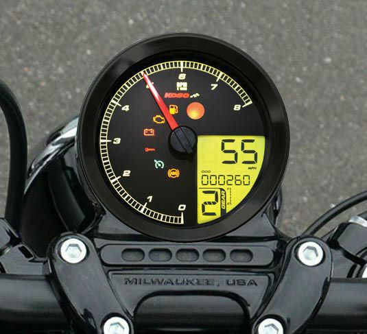 スピード(デジタル)と回転数(アナログ)と各種インジケータを同時に表示可能なコンビネーションメーター。 標準装備のメーターに比べ表示できる情報が多く、8色にカラーチェンジが可能です。 マイル/キロメートル 表示選択可能。 エンジン温度、時計、ボルトメーター、ギアポジション等が表示可能です。 取付けはメーター裏側のコネクタを外して、KOSOメーターの裏側に取り付けるボルトオンです。 フューエルレベルセンサーキット(61200008A)を装着すれば(タンク取り外して取付け、配線が必要です)燃料レベルも表示可能です。 ※ギアポジション表示は機構上不正確なポジションが表示される事があります。 仮組のみ