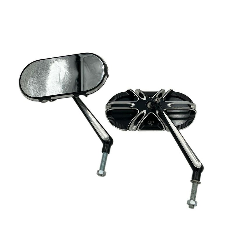 ミラー本体は6方向計12本のアームで支えられ、鳥カゴのようなデザインです。 本体とミラーステーは鍛造アルミニウム製。 ミラー回転軸はステンレススチール製。 左右セット 目立つキズ等ありません。 写真は実商品です。(写真2枚目は取り付けイメージです。) 程度:★★★☆☆