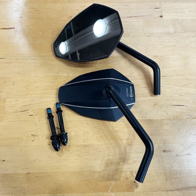 8角形をべースに広い鏡面を確保し、最も視界が広いハウジングを採用しています。 アルミハウジングにコントラストカットを施したミラー。 振動に強く後方視界に優れる、直径12mmの極太ロングロッド採用。 キレイな状態です。 写真は実商品です。 程度:★★★★☆