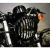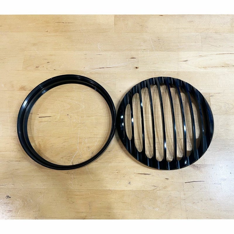 スポーツスター、ダイナ、FX系ソフテイル、ストリートなどに装着されている5.75インチ径ヘッドライトに合わせたグリルカバーです。 ヘッドライトのガード効果と共に、トラッカー系のドレスアップに最適です。 外径は168mm。 ブラックアノダイズ仕上げです。 目立つキズ等ありません。 写真は実商品です。(写真2枚目は取り付けイメージです。) 程度:★★★☆☆