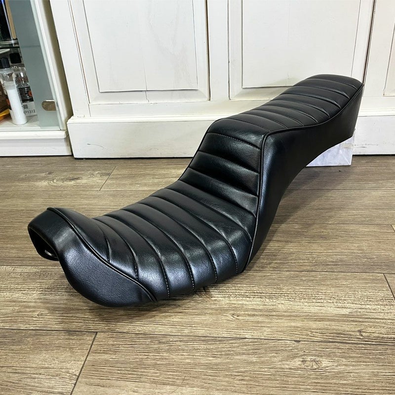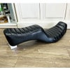 機能性を優先したオリジナルパーツを手掛けるTramp製のシートです。 ハーレーがもっともワイルドだった70年代を匂わせるキング&クイーン です。 シートの前側では、内股をかわすためパイピングを逃がすなど、見た目もさることながら、ホールド感に優れたシートです。 特にFXDLにすごく似合うと思います。 キレイな状態です。 写真は実商品です。 程度:★★★★☆