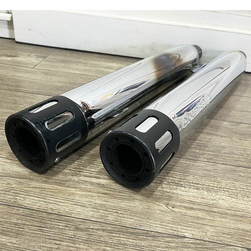 聞いただけでハーレーと判る音になり、パフォーマンスも向上します。 社外マフラーの中には抜けが良すぎて、アイドリングの上昇や不調をきたす事がありますが、スクリーミンイーグルのマフラーはハーレーが開発したカスタムマフラーなので問題なく使用できます。 焼け、塗装への等のダメージ、内部のサビがあります。 ガリ傷はありません。 写真は実商品です。(写真3枚目は取り付けイメージです。) 程度:★★☆☆☆