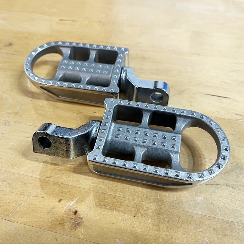 デザインはスティーブ・マックイーンがレースで活躍した、1960~1970年代のデザートレース用バイクのペグを彷彿させる武骨なデザイン。 本体は一体成型のステンレススチール製。 ラバーの無い金属剥き出しの幅広ステップには滑り止めのギザギザがつき、ワイルドなフットペグです。 目立つキズ等ありません。 写真は実商品です。 程度:★★★☆☆