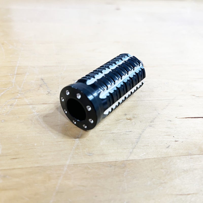 高強度アルミ合金A6061-T6を削り出し加工しています。 滑り止め模様とエンド部分のドット模様が精緻に加工された凝ったデザイン。 ブラックのベースに切削部分はシルバーのコントラストカラー。変色や腐食に強く、耐摩耗性を向上するアルマイト処理済みです。 ※写真のフットペグは付属しません。 キレイな状態です。 写真は実商品です。(写真3枚目は取り付けイメージです。) 程度:★★★★☆
