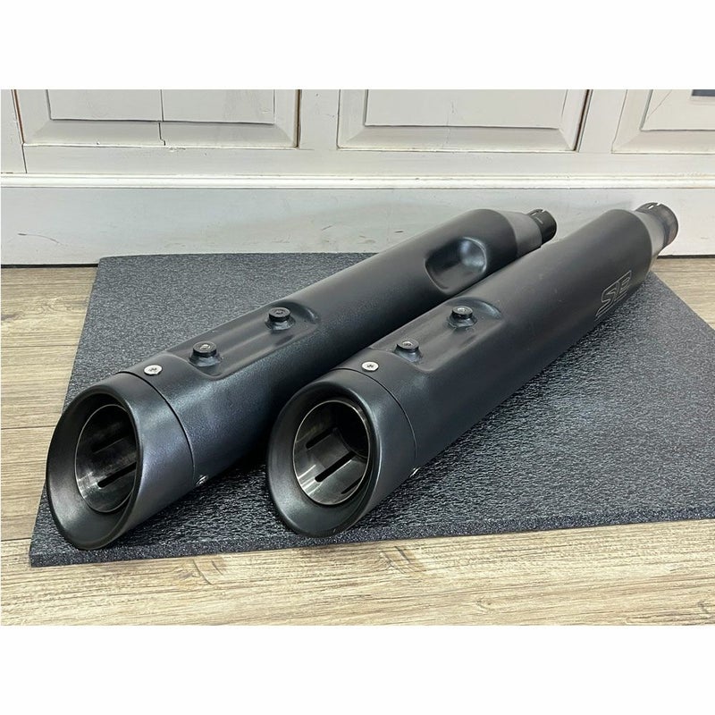 ハーレーのレースブランド「スクリーミン・イーグル」のカスタム・マフラー。 純正スクリーミンイーグル・マフラーはハーレーでチューニング&テストを行っており、社外マフラーに比べ、性能と音のバランスが良くクロームの品質も高いのが特徴です。 マフラーボディは4.5インチの迫力あるサイズです。 マウントを新開発することで、マフラーボディとサドルバッグのクリアランスを小さくし、横から見たときに太いボディが全体のシルエットと調和するようにしてあります。 音質は深みのある低音サウンドです。 ハーレーらしいサウンドと、近隣への騒音配慮のバランスをとるため、バッフルの容量を大きくとり、パーシャルスロットル付近での音量を抑えるようにチューニングしてあります。 ステージ1(吸排気効率向上によって10%の馬力アップ)チューニング用です。 馬力とアクセルレスポンスが向上します。 ※吸気系(エアクリーナーおよび燃調)のチューニングも合わせて行えば確実にパワーアップが実感できます。 サイドにはSEのエンボスロゴ入りです。 エンドキャップ(65100076)付属 ※2021以降ツーリングには別途ガスケットが必要です。 エキパイ側に取付けに伴う傷はあります。 ガリ傷もなく、綺麗な状態です。 写真は実商品です。(写真4枚目は取り付けイメージです。) 程度:★★★★☆