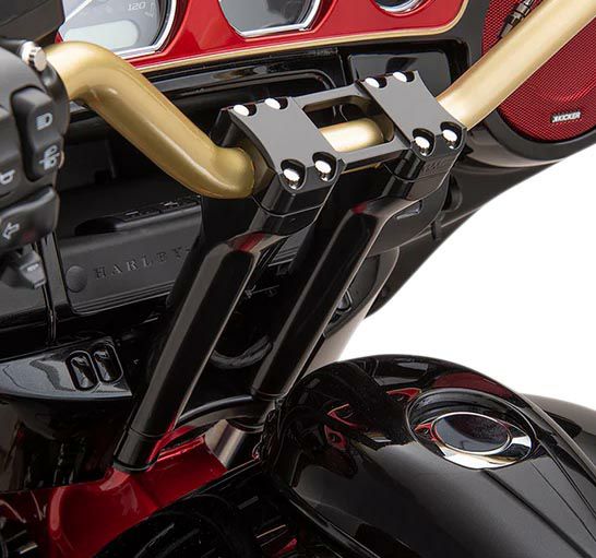 ハーレー用 ストレートライザーです。 ライザーボルトセンター間3.5インチ(約8.9cm)。多くのハーレーのトリプルツリーにマッチします。 軽量かつ丈夫なビレットアルミニウム製。CNCマシンによる削り出し加工品です。 トップクランプは左右ライザーを2本のブリッジで繋ぐデザイン。 クランプボルトが付属します。 ブラックのベースにトップクランプは斜めカット部分がシルバーのコントラストカラー(リバースカット)です。 クランプ部は1.25インチ径