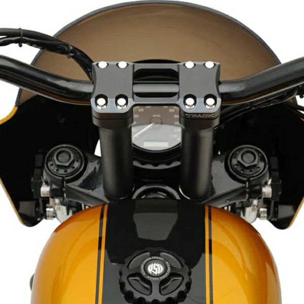 ハーレー用 ストレートライザーです。 ライザーボルトセンター間3.5インチ(約8.9cm)。多くのハーレーのトリプルツリーにマッチします。 軽量かつ丈夫なビレットアルミニウム製。CNCマシンによる削り出し加工品です。 トップクランプは左右ライザーを2本のブリッジで繋ぐデザイン。 クランプボルトが付属します。 ブラックのベースにトップクランプは斜めカット部分がシルバーのコントラストカラー(リバースカット)です。 クランプ部は1インチ径
