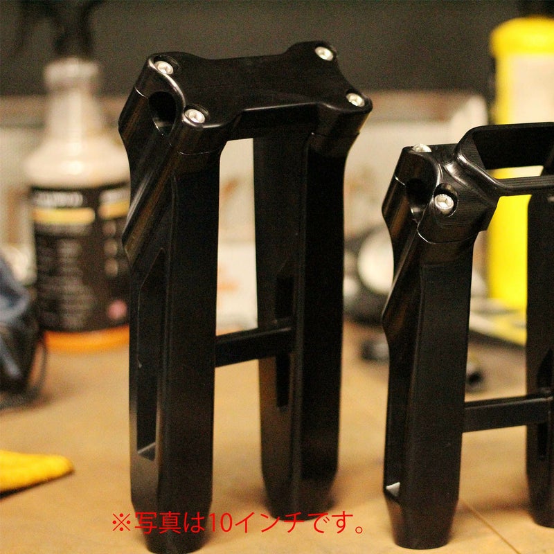スタンダードトップクランプ付きライザー。 スピードキングサイクルのライザーで8インチ以上の高さの物はねじれ強度を増すために左右のライザーを連結するバーが入っています。 形状はストレートですが、ハンドル取り付け部は1インチプルバックしています。 本体が太く剛性に優れ、見た目の迫力も増します。 強度と安定性に優れた、6061アルミニウム製。 トップクランプ部には、専用のカーボンインサート(別売り)が装着可能です。 ※商品写真は10インチのものです。