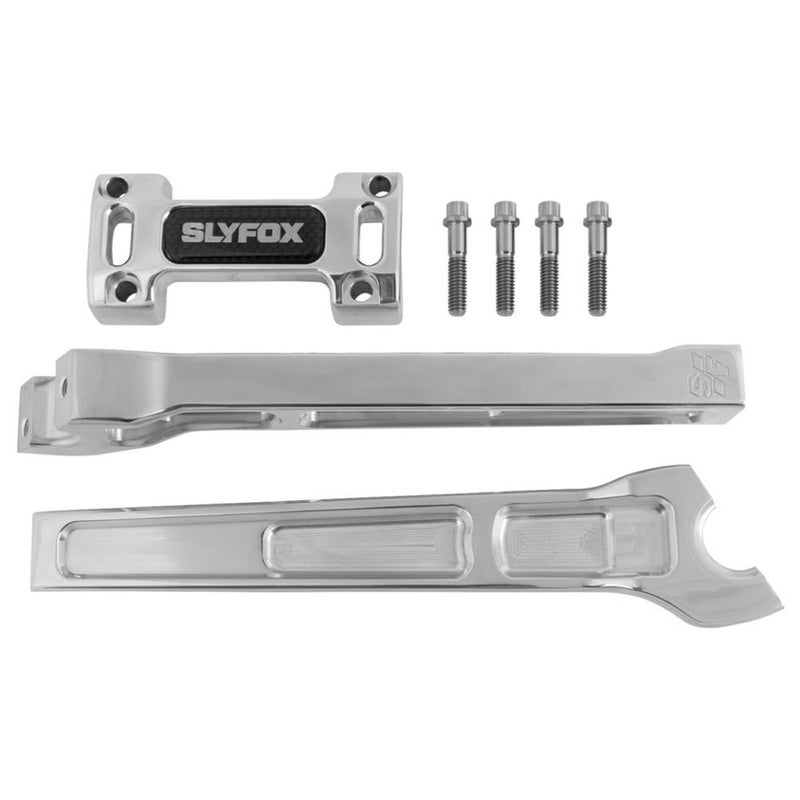 パフォーマンスバガー用パーツを主体とするカスタムパーツメーカー、SLYFOX(スライフォックス)のアルミビレットライザー。 ストレートタイプ。 トーチ型のシェイプが特徴です。 ロゴ入り。 トップクランプは左右をブリッジした形状です。 ライザーボルト穴センター間は3.5インチ(約8.9cm)。多くのハーレーに使用可能です。(スプリンガーモデル不可) 高品質な6061-T6ビレットアルミニウム製。CNCマシンによる削り出し加工品です。 高品質で有名なARP社製のトップクランプボルトが付属します。