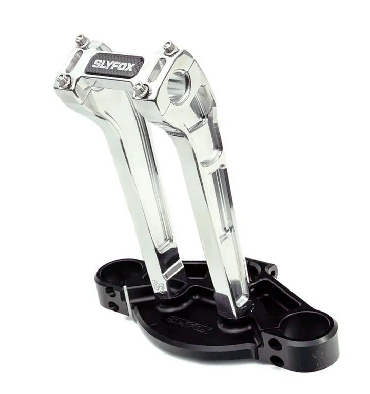 パフォーマンスバガー用パーツを主体とするカスタムパーツメーカー、SLYFOX(スライフォックス)のアルミビレットライザー。 プルバックタイプ。 トーチ型のシェイプが特徴です。 ロゴ入り。 トップクランプは左右をブリッジした形状です。 ライザーボルト穴センター間は3.5インチ(約8.9cm)。多くのハーレーに使用可能です。(スプリンガーモデル不可) 高品質な6061-T6ビレットアルミニウム製。CNCマシンによる削り出し加工品です。 高品質で有名なARP社製のトップクランプボルトが付属します。