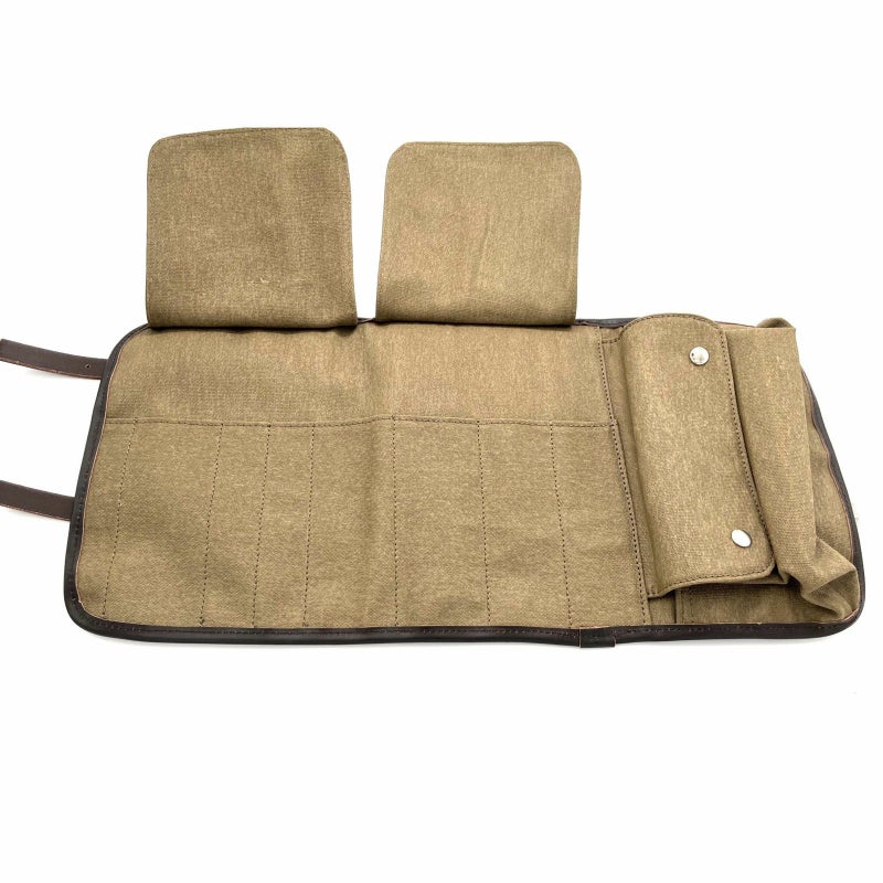 スペイン製のワックスコットン・キャンバスと本革ストラップの丈夫なツールバッグです。 <特長> ●ビンテージスタイルの武骨なルックス ●防水性が高く、丈夫なワックスオイル・コットンキャンバスを使用。 ●ストラップは使い込むほどに味わいの出る本革製 ●開口部はロールアップ式 ●書類やツールを収納できるポケット付き ※バッグのみ。写真のツールは付属しません