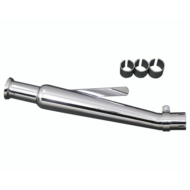 スポーツスター、ダイナ、ソフテイル 他ハーレー用 スリップオンマフラーです。 エンド先端がトランペット形状の、オールドスクールチョッパーに似合うデザイン。 歯切れの良い排気音になります。 跳ね上げ角度約18度のアップタイプ。 跳ね上げ形状および口径を絞り込んだエンド形状並びに、脱着可能なインナーサイレンサーで、排圧を確保しています。 インナーサイレンサーは別売の全長2インチのショートサイズ(000314)に交換すれば、音量・排圧を調整できます。 エキパイ差込口は、付属の3種類のスペーサーで1-1/2インチ(約38mm)~1-3/4インチ(約45mm)まで対応します。 ※取り付け車両のエキパイ径をご確認ください。 クランプ x 1 スペーサー x 3(外径40mm、外径43mm、外径46mm) が付属します。 汎用品のため、取り付けにはステー等の加工が必要です。 右用 単品販売