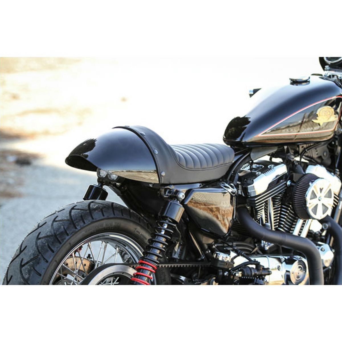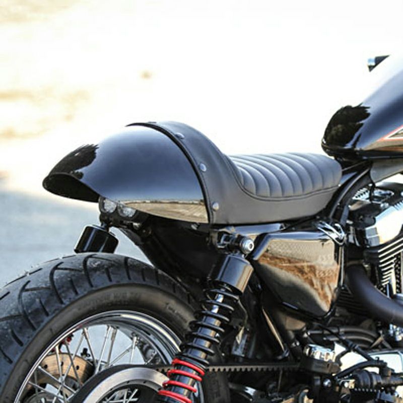 スポーツスター用 カフェレーサースタイルのシートカウルキットです。 <特長> ●スポーツスターのテールセクションをクラシックカフェレーサースタイルにドレスアップします ●シート部分はプリーツステッチデザイン。ゲル入りで快適な座り心地 ●丸みのあるクラシックレーサー風シートカウル ●カウル部分は未塗装(ブラックゲルコート仕上げ)。好みのカラーにペイントしてください ●ECM用サポートブラケットが付属 ※リアフェンダーは取り外し、シートレールは切除します。 ※テールライト、ウィンカー、ナンバーは移設が必要です。 ※車両装着写真は塗装例です。(参考写真)
