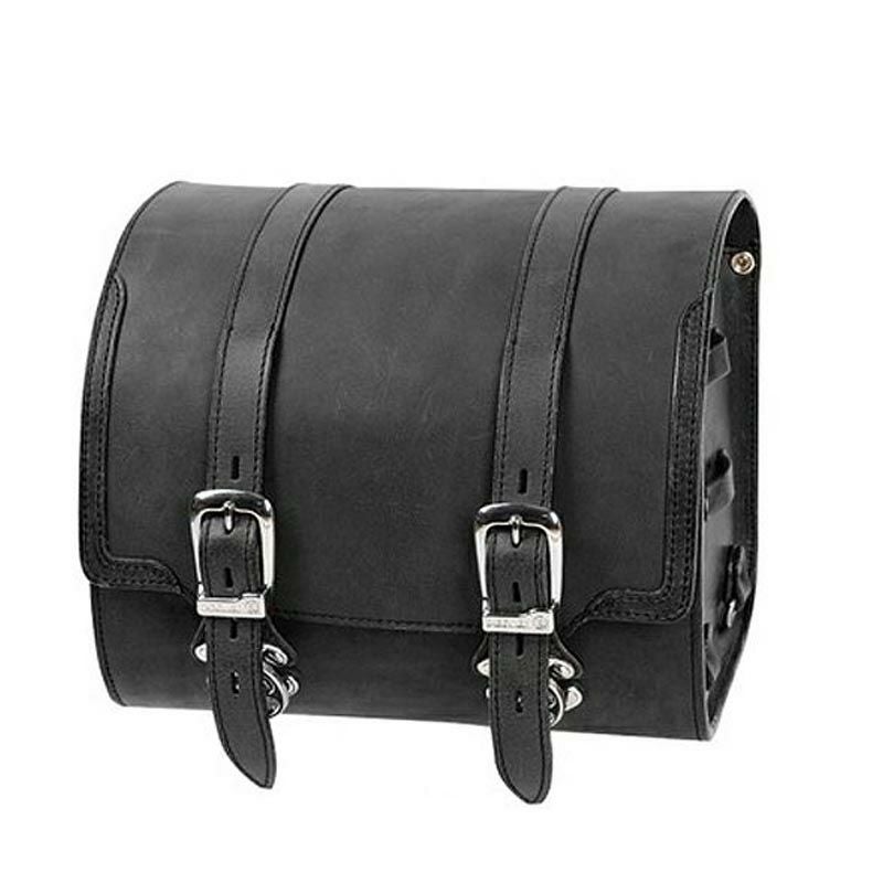シーシーバーにも取り付け可能な、ドラム型レザーサドルバッグです。 縦方向の長さが短めで車体左右どちらでも、気軽に装着出来ます。(アップマフラー装着車は除く) 内部はシンプルな一室タイプで、トレジャーボックスのような小型ですが十分な容量がありますので、無造作に物を放り込んでおけます。 リッドストラップはクイックリリース金具付き。 背面は装着用のストラップを縦横方向に装着出来る仕様です。シーシーバーにも取り付けできます。 側面のループはドリンクホルダー等色々な物を括り付けるのに便利です。 側面下部のリングはベルトを通してキャリアに括り付けるのに便利です。 取付け用ストラップ2本、レインカバーが付属します。 ※写真はブラウンのものを含みます(参考写真) ※本革製品につき、色の濃淡やキズがある場合がありますが、不良品ではありませんので、あらかじめご了承ください。