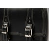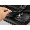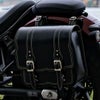 ブラックの革にホワイトのステッチがデザインアクセントの、本革製サドルバッグです。 10Lの容量で、内部はシンプルな一室タイプ。 スクエアシェイプで、小ぶりながらもツーリングに便利な10Lの容量を確保しています。 内部には車検証等を収納するのに便利なオープンポケット付きです。 素材は本革製。使い込むほどに経年による風合いの変化を楽しめます。 リッドには2本の革製ストラップ付。ゴージャスなルックスの長さ調整用バックルと、裏側にはワンタッチで開閉できる金具付きです。 車体への装着用ストラップ2本が付属します。