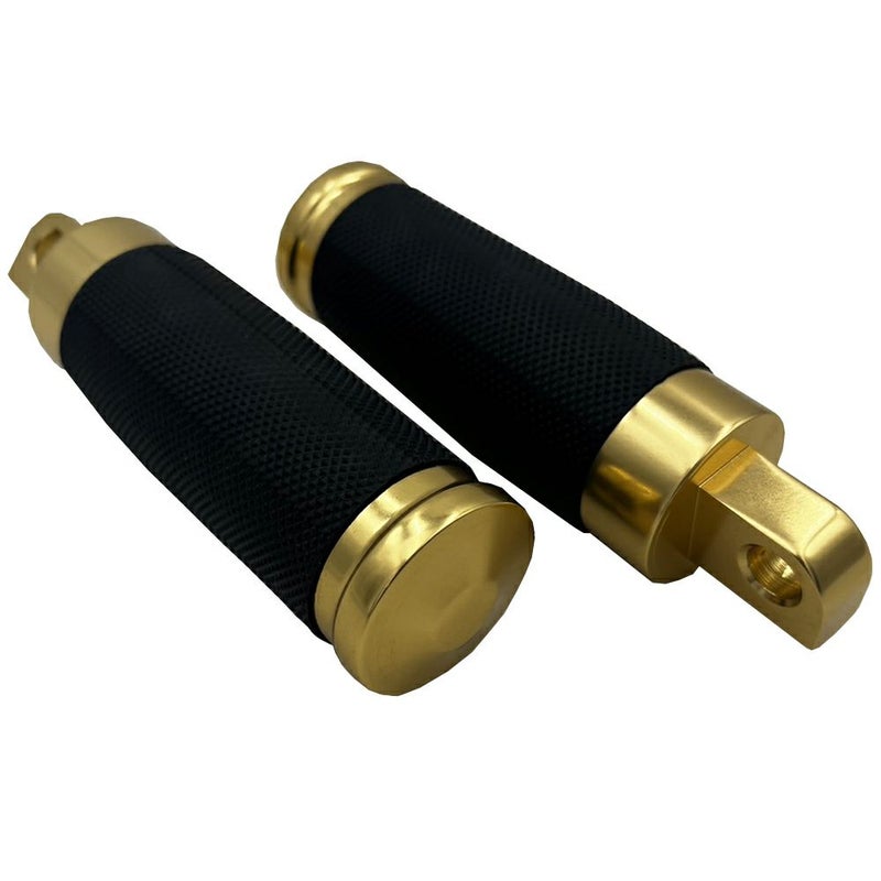 アルマイトゴールドのオス型マウントフットペグです。 質感も良くローレット状のラバーが巻いてあるので滑りにくく 操作性が向上します。 アルマイト仕上げ。 ブラックアウトの車両と相性抜群です。 長さ:約10.4cm 太さ:約3.5cm ※XL1200X、XL1200CB、XL1200Vには、ステップ・コンバージョンキット (HD-05284、505502等) が必要です。 2018以降ソフテイルに装着する場合は、ライダー側アダプター(DK-M8-SFT-FPA、又はHD-05385)、パッセンジャー側アダプター(HD-05440)が必要になります。 ※ライダー側、パッセンジャー側で、アダプターが異なります。