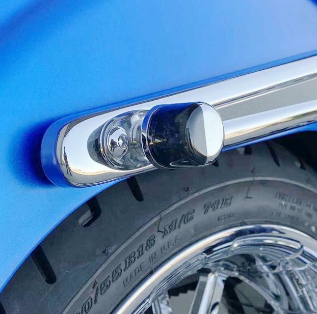 縦溝の入った、フルート型 LEDウインカー。 1インチ(2.5cm)と小型で目立ちません。 高輝度LEDランプが24個内蔵で小型でも明るいウインカーです。 CNCマシンカット。 5/16"-24のネジ山付スタッドボルトが付いています。 左右2個売り