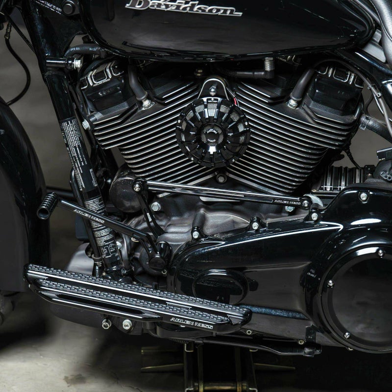 ハーレー ツーリング用 フットコントロール延長キットです。 <特長> ●シフトペダル、ブレーキペダルを3インチ(約7.6cm)前方に伸ばします。足元に余裕が出来、脚の長いライダーもクルージングがより快適になります ●ソロシフトアーム、ブレーキアーム、インナーシフトレバー、シフトロッド、フットボードブラケットのキット ●フットボードブラケットはArlen Ness(アレンネス)製フットボード専用設計。フットボードの位置も前に出します ●ソロシフトアーム用のスペーサー付属 ●シフトロッドは専用設計の球面軸受けベアリング圧入済み。ハイムジョイントよりもすっきりとした外観で、かつスムースに作動します ●ビレットアルミニウム製。CNCマシンによる削り出し加工品です。 ●クールなブラックカラー。アルマイト仕上げ ※2000~2007 ツーリングへ装着の場合、別売ブレーキアームアダプター(420-027)が必要です。