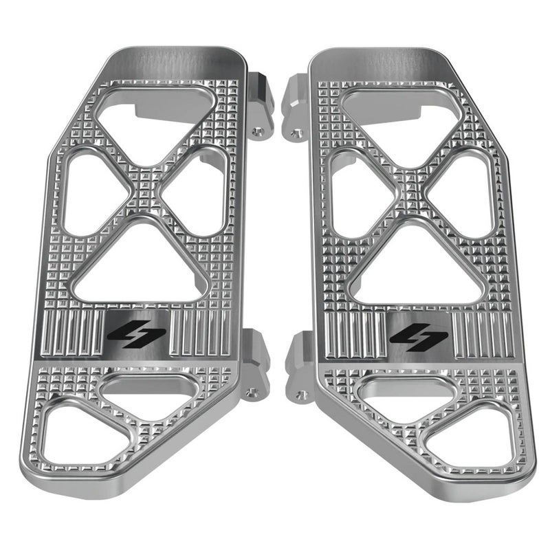 M8 ツーリング用 フロアボードです。 <特長> ●ノーマルよりも1インチ(約2.5cm)高く、2インチ(約5cm)下がり足の位置がライダーの重心に近づくことで、スポーツライディング時にステップ荷重をかけやすくなります ●ヒールを乗せる部分は水平になっており、アグレッシブなライディングをサポートします。張り出し幅の調整可能 ●底面は外側に向けてテーパーしており、コーナリング時のバンク角を最大限確保します ●ビレットアルミニウム製。軽量かつ頑丈です ●スポーティーなアルミシルバー、マシンフィニッシュ ●左右セット ※2023以降CVOロードグライド/ストリートグライドは フロアボード用ショルダーボルト(50674-05)4本が別途必要です。 ※2024以降CVOロードグライドSTはフロアボード用ショルダーボルト(50674-05)4本およびフロアボードフロントブラケット(47200302A)2個が別途必要です。 ※車両装着写真はブラックカラーのものです(参考写真)