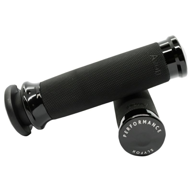 ハーレー スポーツスター、ダイナ、ソフテイル、ツーリング、Vロッド ケーブルスロットル車用ハンドグリップです。 本体はアルミニウム製。 AVON製の滑り止めラバー付です。 エンドキャップにはレーザー刻印されたSLYFOX PERFORMANCEのゴロが入り、レーシーな雰囲気です。 ケーブルスロットル車用 左右ペア