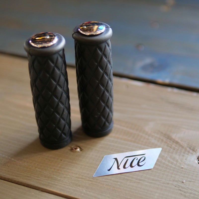 レトロスタイルのカスタムにマッチする、ハーレー用 内径1インチ・グリップラバーです。 <特長> ●耐熱性、耐候性に優れ、劣化しずらい高品質ラバー ●レトロモダンなダイアモンドパターン ●使い込むほどに艶が出てビンテージグリップのような味わいになります ●ブラックのラバーにクロームのキャップ付き ※車両への取り付けにはスロットルチューブが必要です。