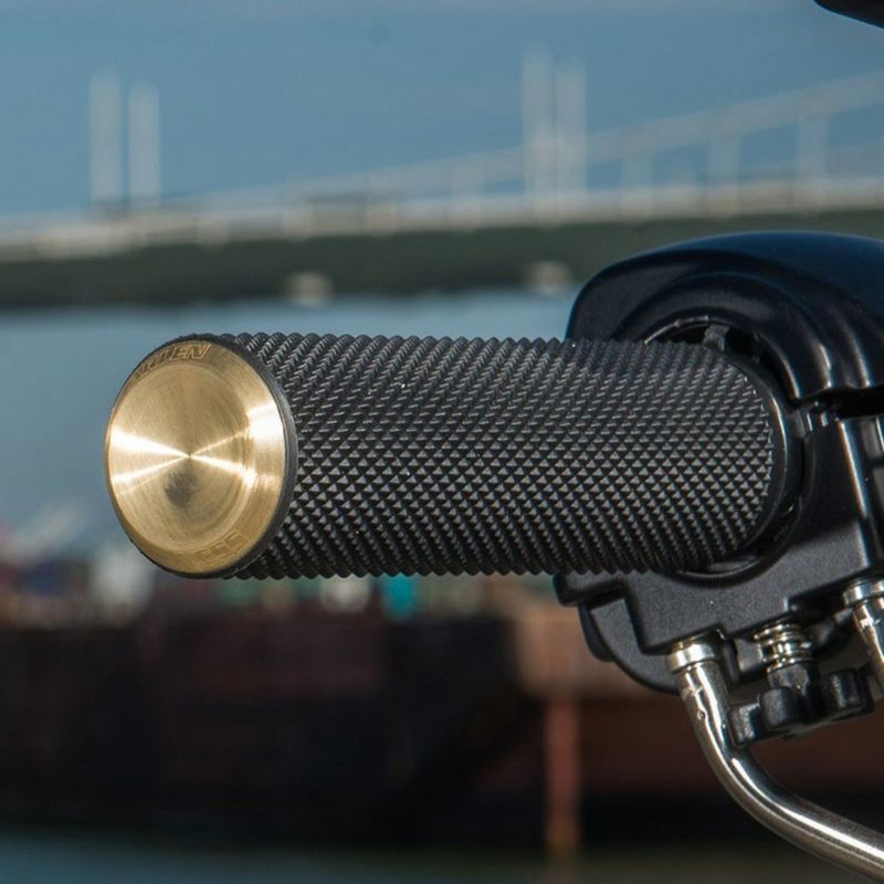 2023以降 CVOロードグライド、CVOストリートグライド、2024以降 ロードグライド、ストリートグライド用 ハンドグリップセットです。 <特長> ●滑り止めのナール模様付きラバー。シンプルでありながらカスタム感溢れるルックス ●ブラス(真鍮)削り出しのエンドキャップ。ARLEN NESS(アレンネス)のロゴ刻印入り ●新型電子スロットル機構に対応 ●左右ペア ※車両装着写真は他車種用のものです。(参考写真)