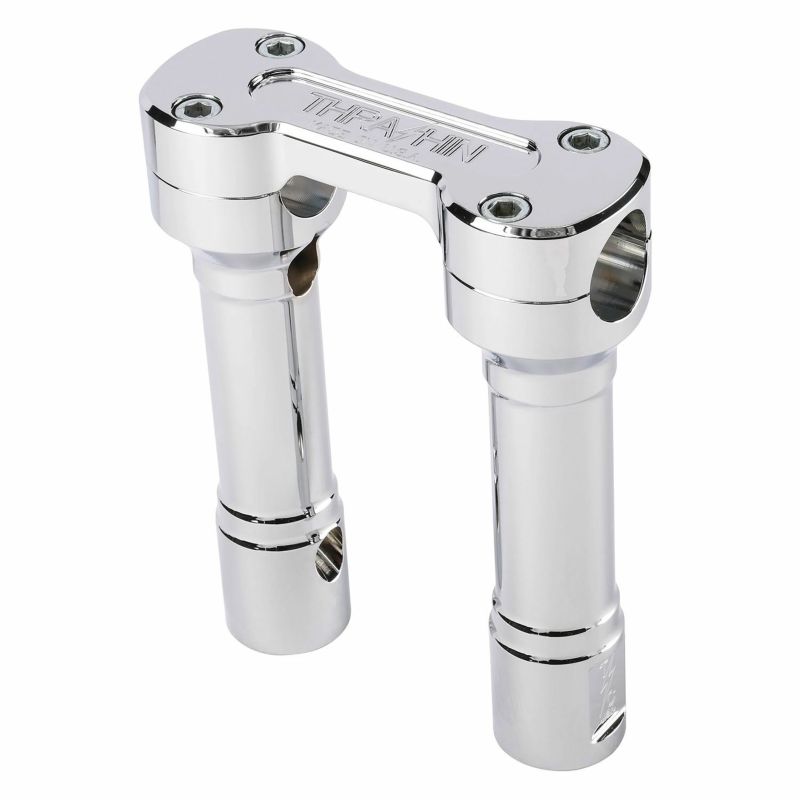 ビレットアルミニウム製の非常に質感の高いライザーです。 メーカーロゴ入りのトップクランプも付属します。 剛性が高く、精密に作られているため、ハンドル廻りがよりカッチリとし、安定感が高まります。 仕上げは、通常のクロームに比べ劣化の少ないトリプルニッケルメッキです。 取り付けボルト穴は、標準サイズの1/2-13のボルトが使用出来ます。 1インチハンドル用。 ※装着写真は10インチ(TSC-1010-3)です。