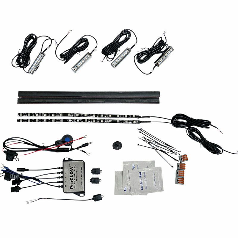 車両を全体的に照らすフルキットの車体ライト。 15個のLEDが搭載されたフレキシブルストリップが2本付属し、エンジン部等を照らすのに最適です。 その他、取り付けの際に便利な取り付けスティックが2本、色が変化するLEDポッドが4個付属。 照明パターンやON、OFFの切り替え等の操作は専用アプリにてスマートフォンで操作します。