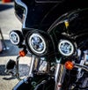 明るいプロジェクタタイプのHALOリング付き7インチLEDヘッドライトです。 上下の大型のプロジェクターLEDで明るく前方を照らします(それぞれロー&ハイビーム)。左右のLEDで広がりを持たせています。 ノーマルのライト(バルブ)に比べ、白昼光に近い光になります。 デュアルハロゲンヘッドライト装着車は45011が必要です。 2014以降ツーリング用変換アダプタ付属。 デュアルハロゲンヘッドライト装着車は45011が必要です。 ツーリング、FLD (フェアリング装着車およびナセル装着車)用のリングアダプタ付属。 (LEDヘッドライトは通常バルブより厚みがあるので、ノーマルの固定リングが使用できません。コチラを参照) ただしデュアル・ハロゲンバルブ装着車はLED用が装着済み。 ※ヘッドライト常時消灯スイッチ(H4SW)等を装着していればリング部のみ点灯出来ます。 「HALO」の配線(赤色)と車両側ポジション(赤色)接続するとリング部は常時点灯になります。 「HALO」(黄色)、車体側ポジション(黒)は絶縁処理して下さい。