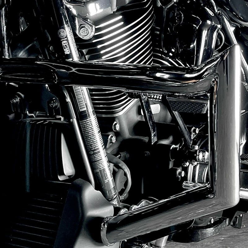 2014以降 ツーリング用 1.5インチ径 チョップドエンジンガードです。 <特長> ●1.5インチ径の極太パイプ。1.25インチ径のノーマルエンジンガードと一線を画す迫力 ●CMC製ーシーバーやELEV8ハンドルバーとの組み合わせにも最適 ●アグレッシブなポインテッドシェイプ ●ゴージャスなショークロームフィニッシュ ●CVOの純正チンスポイラーとの併用可 ●取付けに必要なハードウェアが付属します ※ロードグライドで大型エンジンガード装着車(2020以前モデル)はフェアリングサポートブラケットの交換が必要です。 ※フロントの荷重が増すため、フロントサスが底付きする場合はバンプストッパーの装着等の対策が必要です。