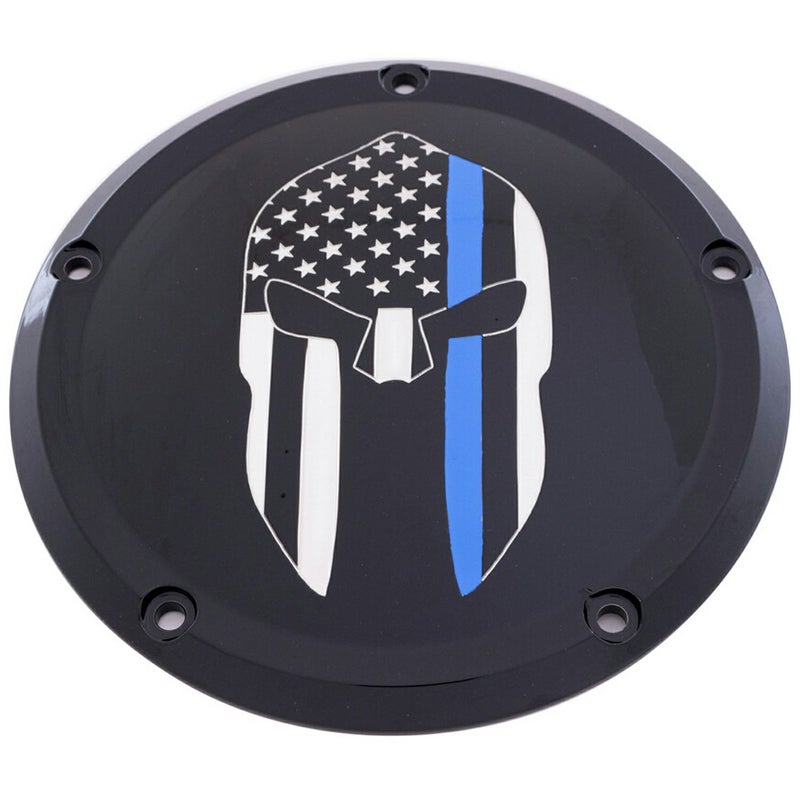 ビレットアルミニウム製の高品質ダービーカバーです。 <特長> ●高品質6061ビレットアルミニウム製。CNCマシンによる高精度削り出し加工品です ●ブラックの地にブルーラインで彩った古代スパルタ兵の兜グラフィック入り ●ペイントは高品質なPPG製自動車用塗料を使用。グラフィック部分の塗装は一品ずつ手作業で行われています