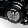 ツーリング、トライク用 ダービーカバーです。 フリーダムと強さの象徴である、アメリカンイーグルとバーアンドシールドを描いた胸躍らせる新デザインシリーズ。 ビレットアルミニウム製。 アルマイト処理されたブラックのベースに、デザイン画とロゴがレーザーエッチングされています。 更にクリアのアルマイト処理を行い、エッチング部分も腐食から保護しています。 ※ナロープロファイルアウタープライマリーカバー装着の、ツーリング、トライク用です。