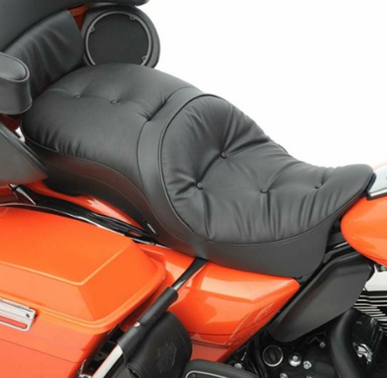 バックレスト対応 ツーリング用 ツーアップシートです。 ピロースタイルでゴージャス感を演出してくれます。 座面表皮は特許取得の太陽光反射レザーになっており、シートの表面温度を下げ、従来のレザーやPVCよりも高い耐久性と長寿命が特徴のシートです。 別売りのバックレスト(0822-0461、0822-0462等)と組み合わせればより快適なツーリングが楽しめます。 シートフォームは最高の快適さの為に成形されたポリウレタン製。 シートパンは厚さ3/16インチ(約4.8mm)の丈夫なABS樹脂製。 裏面は車体ペイント保護のため、カーペットカバーとラバーバンパー付きです。 取り付けに必要なハードウェアが付属しております。
